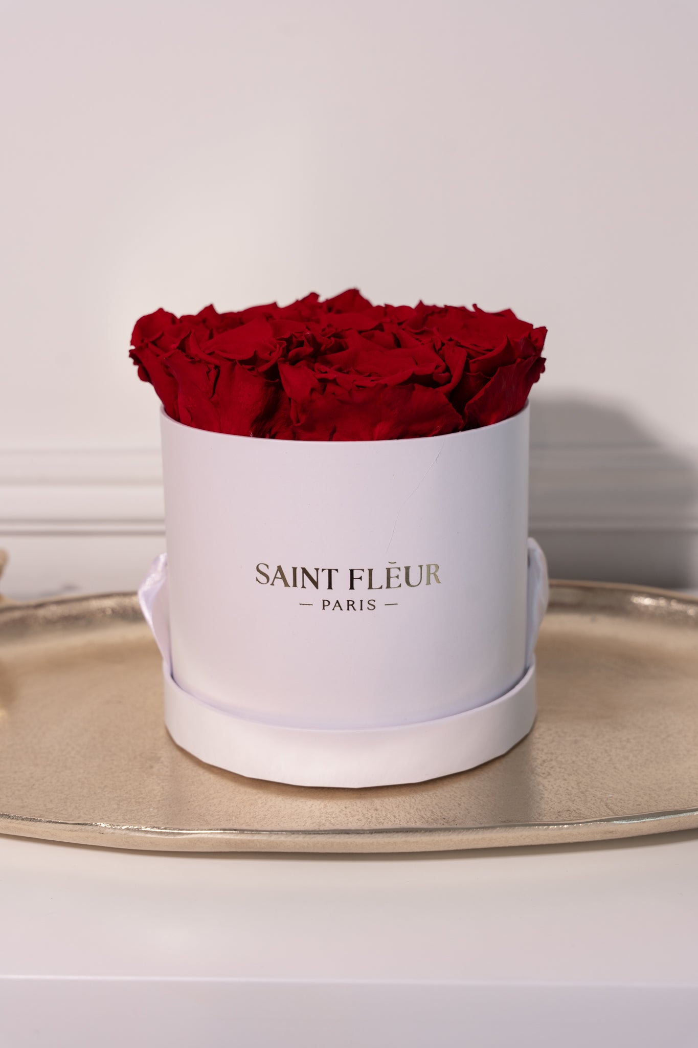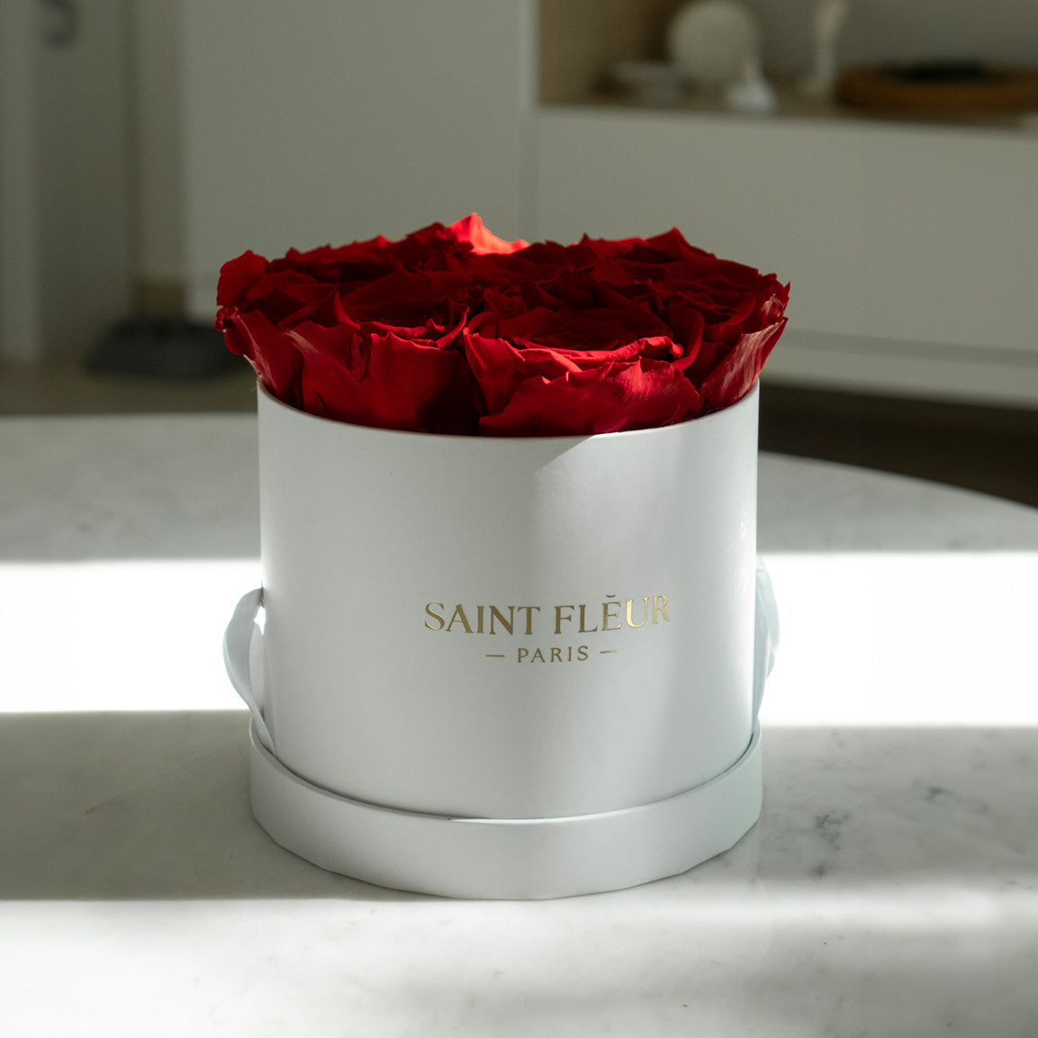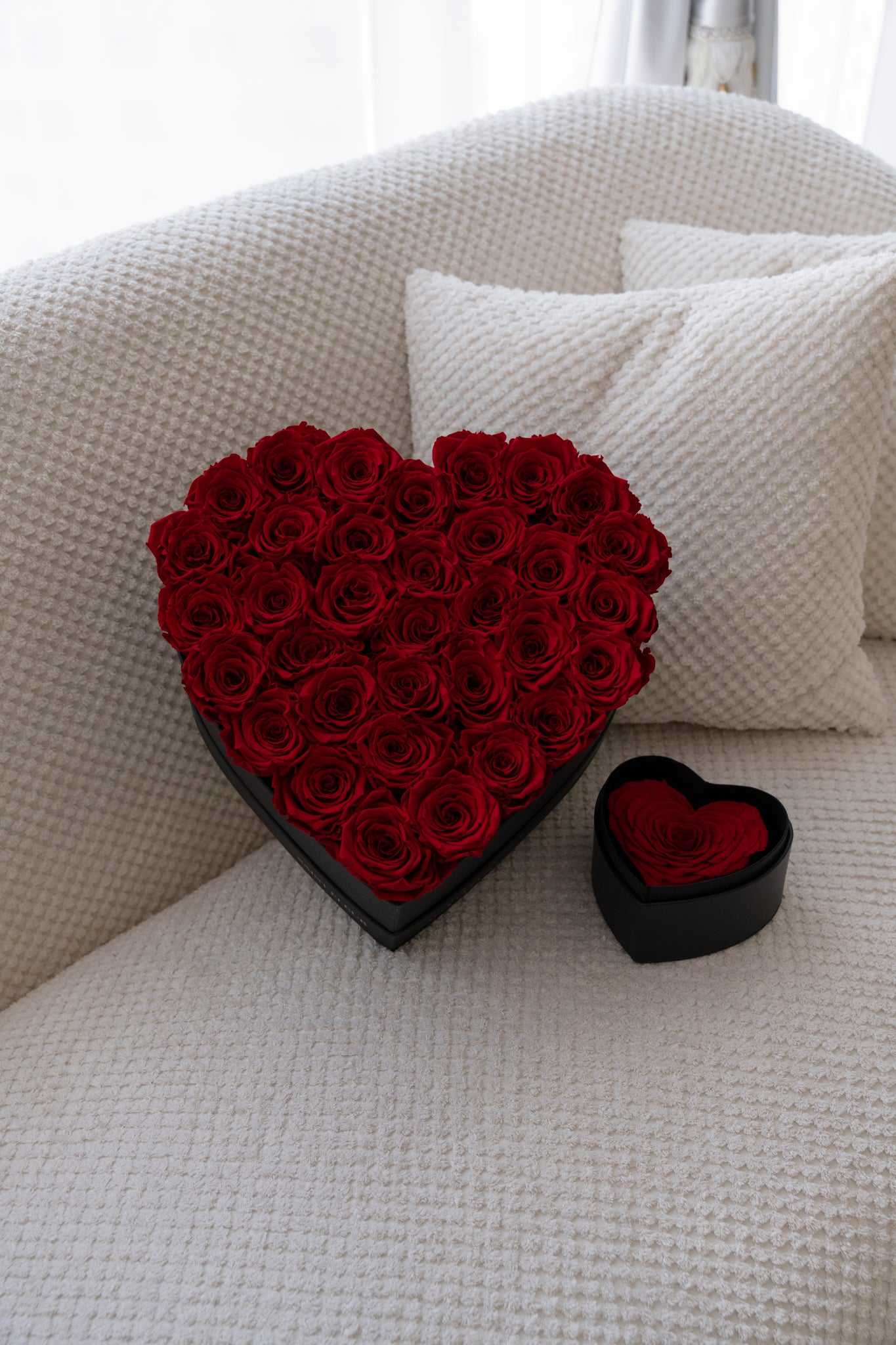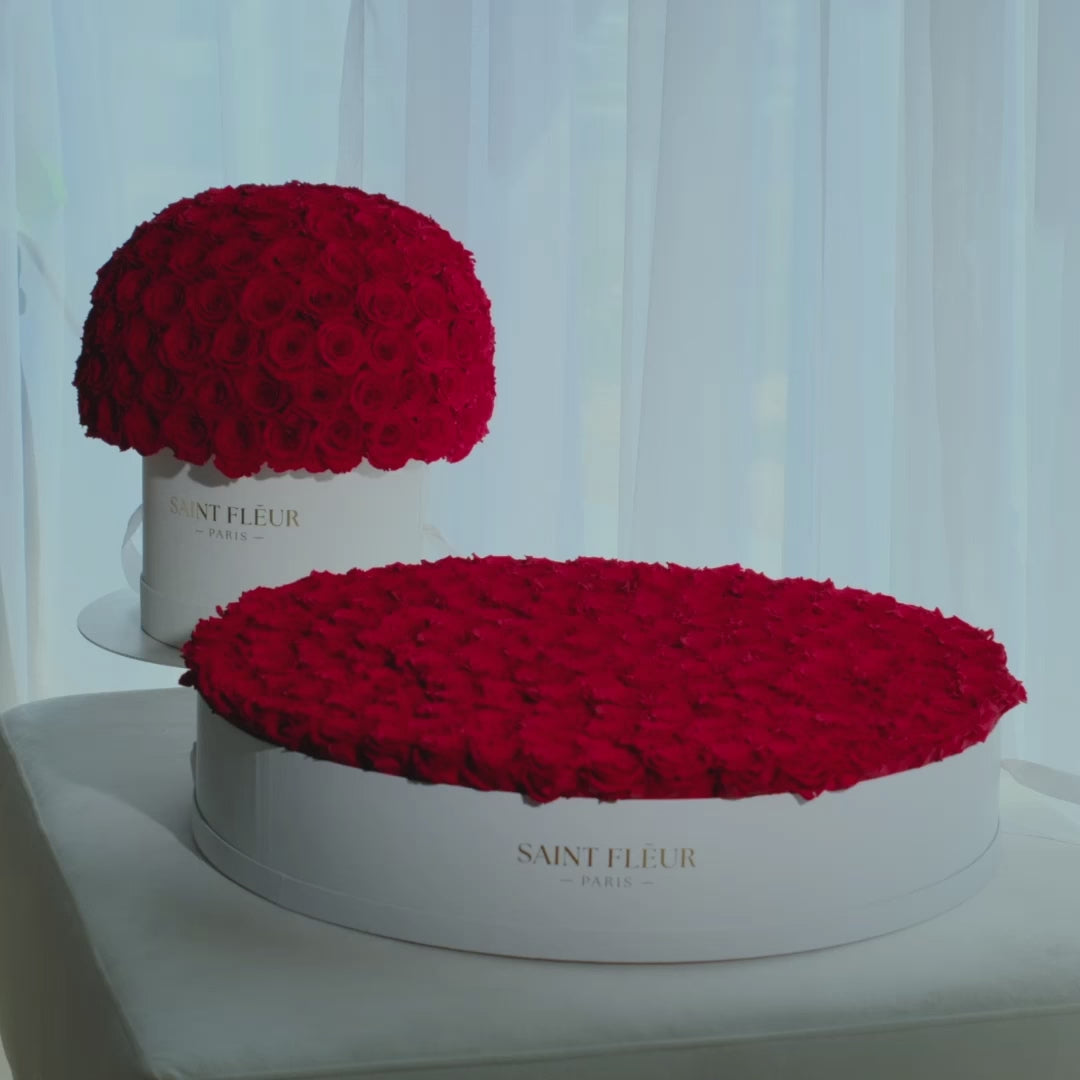 De verzorging van je bloemstuk is eenvoudig: bewaar de rozen in een stabiele omgeving op kamertemperatuur en uit de buurt van direct zonlicht en extreme hitte. Stof ze lichtjes af en behandel het stuk voorzichtig. Geef het geen water en plaats de doos zo dat het niet in contact komt met lichtgekleurde stoffen om ervoor te zorgen dat de rozen tijdloos blijven.