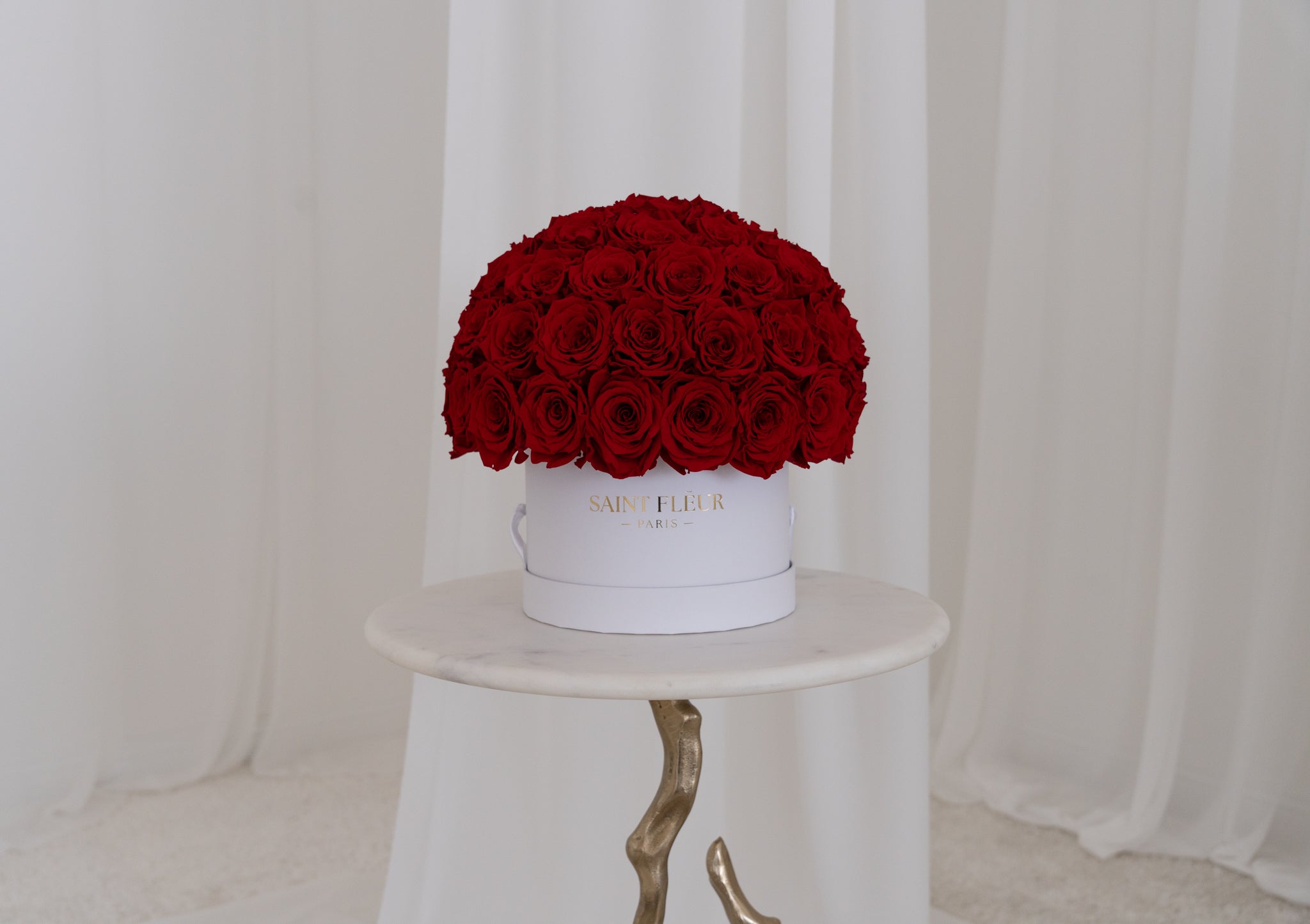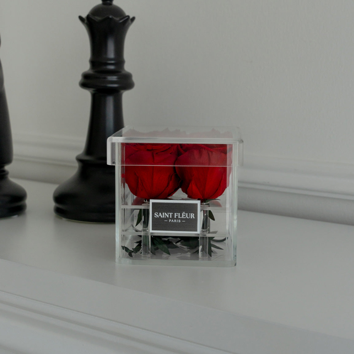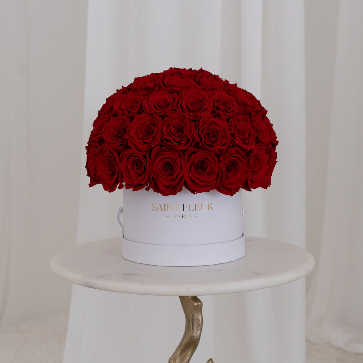 De verzorging van je bloemstuk is eenvoudig: bewaar de rozen in een stabiele omgeving op kamertemperatuur en uit de buurt van direct zonlicht en extreme hitte. Stof ze lichtjes af en behandel het stuk voorzichtig. Geef het geen water en plaats de doos zo dat het niet in contact komt met lichtgekleurde stoffen om ervoor te zorgen dat de rozen tijdloos blijven.